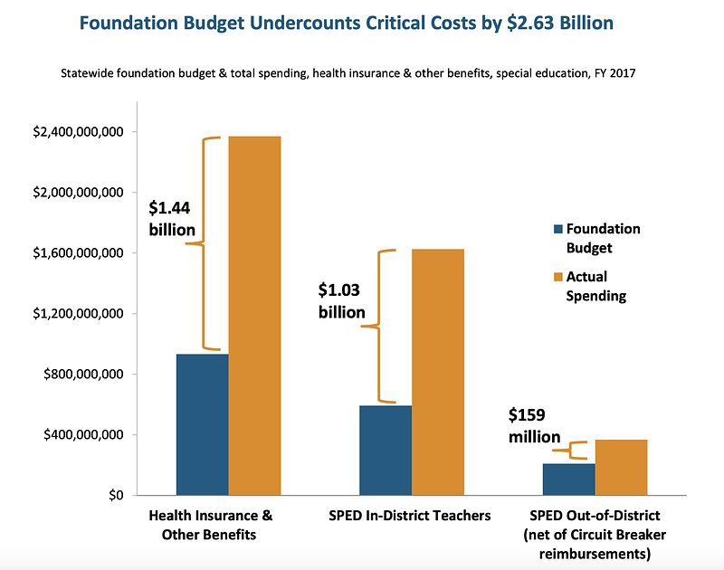 In the years since the 1993 law went into effect, the assumptions baked into the state formula have fallen well short of actual costs, meaning that districts are left to fill in larger and larger gaps between what the state provides and what they need to spend. Among the largest drivers of education costs are health insurance and special education. According to the Massachusetts Budget and Policy Center, in 2017 the foundation budget underestimated costs of health insurance and special education by $2.63 billion statewide.